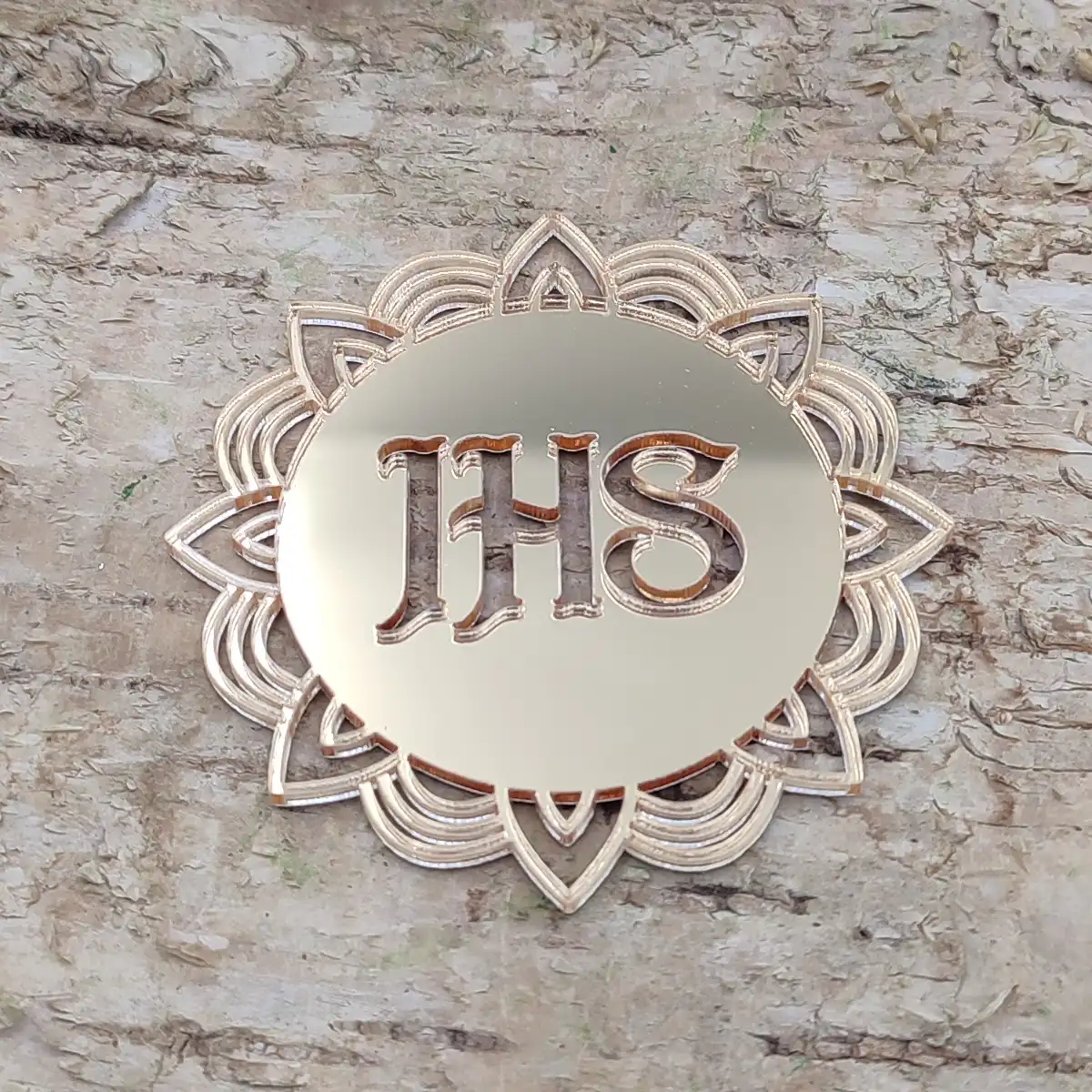 Elegancki, ozdobny element IHS wykonany z wysokiej jakości pleksi lustrzanej o grubości 2 mm. Idealny do projektów komunijnych – zaproszeń, kartek, albumów, pudełek, ramek i dekoracji stołu. Precyzyjne wycięcia i efektowne lustrzane odbicie nadają całości wyjątkowego, uroczystego charakteru.