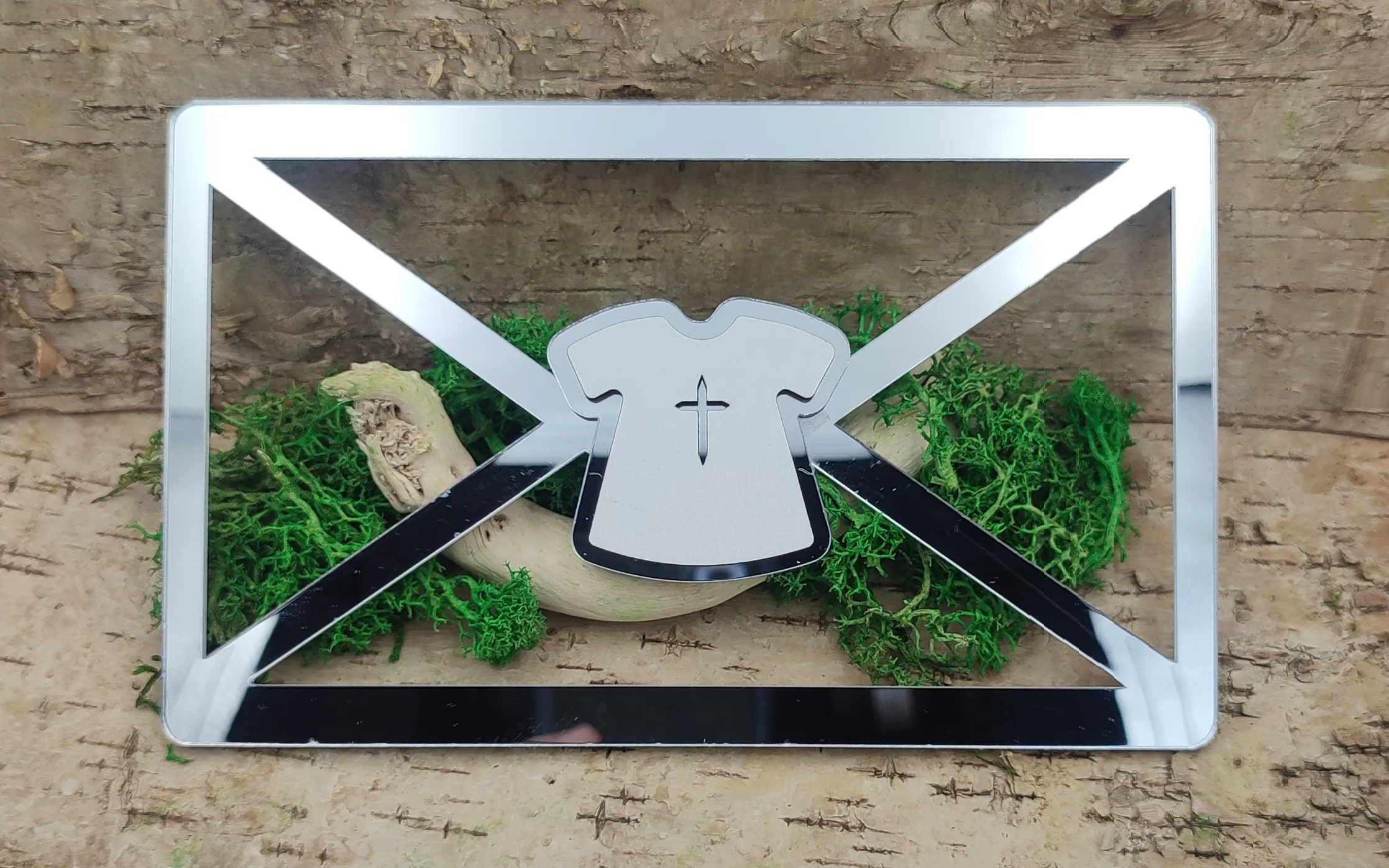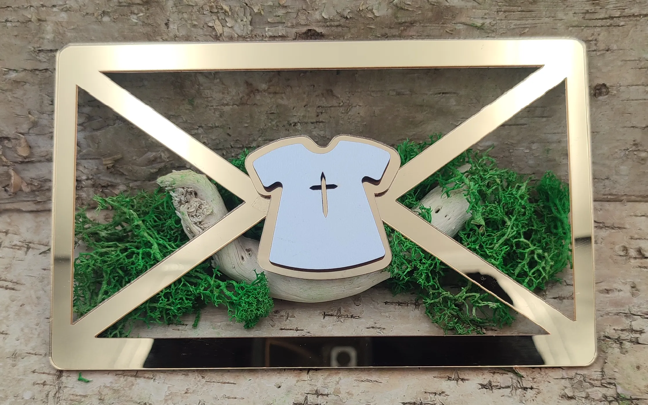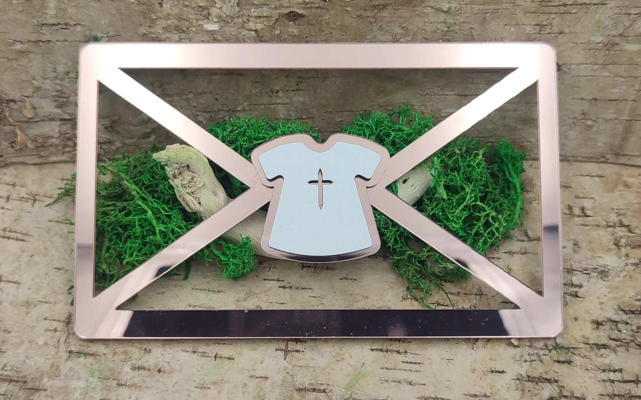 Dekoracyjna koperta na pieniądze wykonana z lustrzanej pleksi to elegancki sposób wręczenia prezentu z okazji Chrztu Świętego. Minimalistyczna konstrukcja w kształcie koperty została wzbogacona o symbol szatki chrzcielnej – znak czystości, nowego życia i przyjęcia sakramentu chrztu.