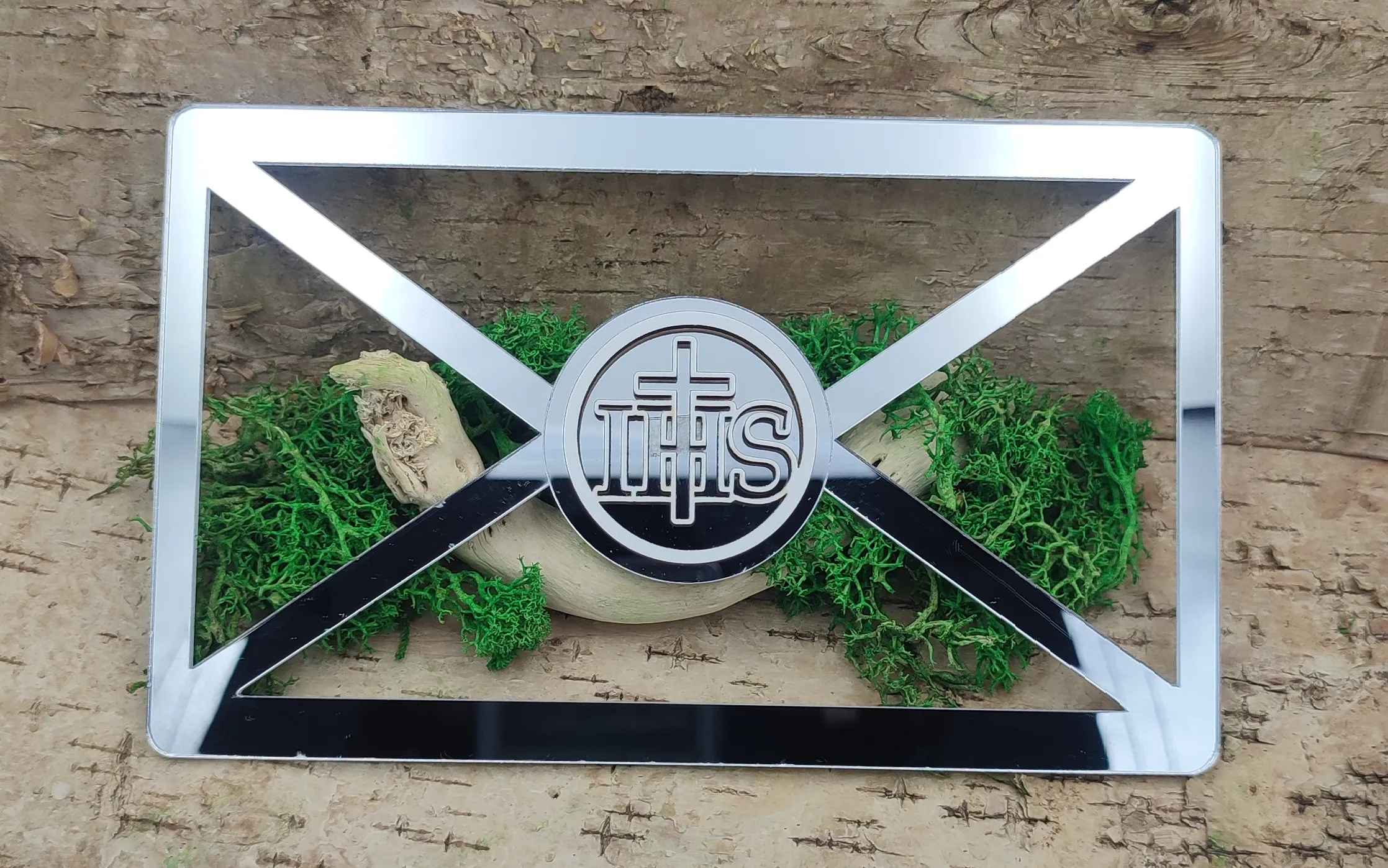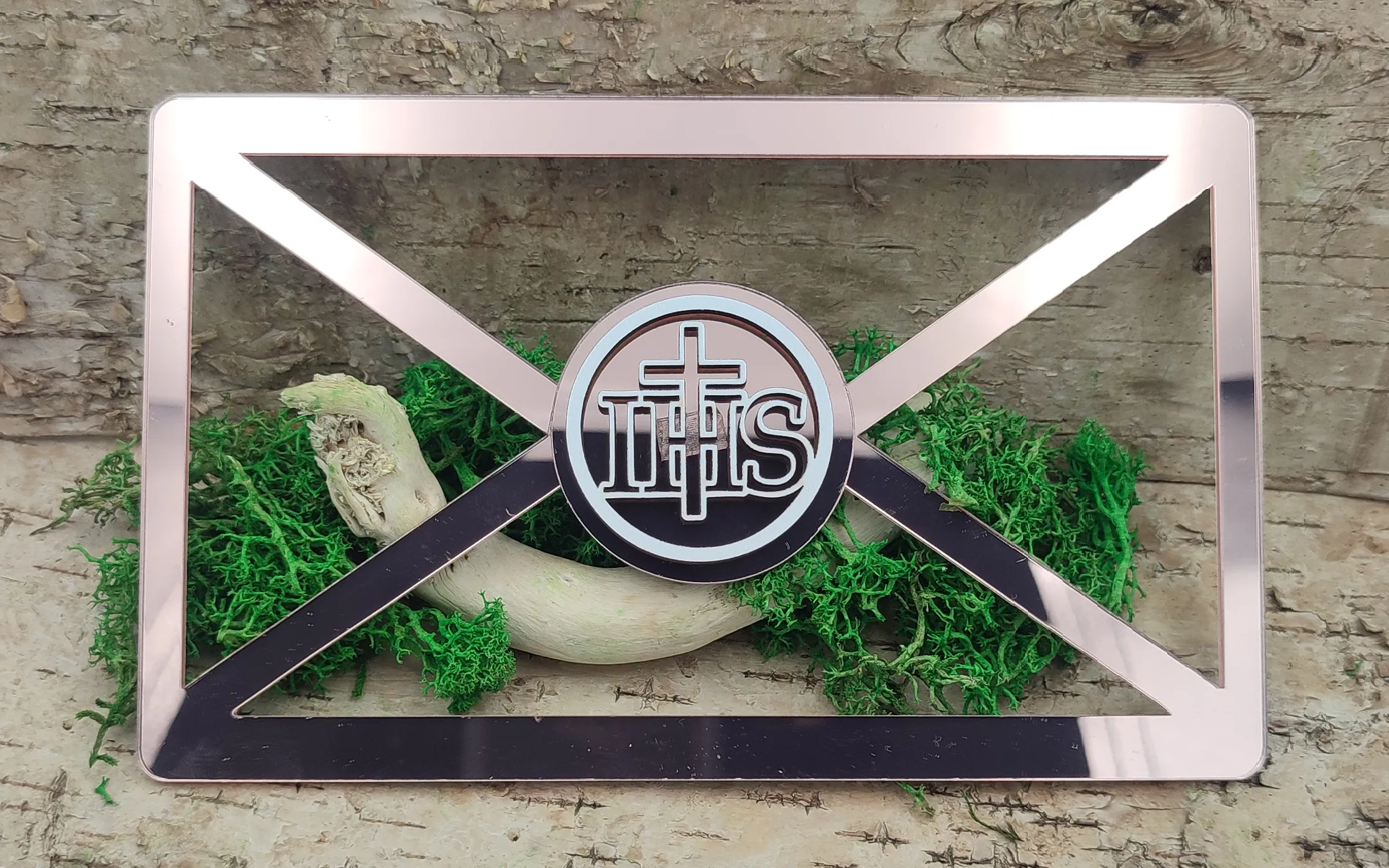 Dekoracyjna koperta na pieniądze wykonana z lustrzanej pleksi to elegancka forma wręczenia prezentu z okazji Pierwszej Komunii Świętej. Nowoczesna konstrukcja inspirowana klasycznym kształtem koperty została uzupełniona symbolem IHS z małym krzyżem – jednym z najbardziej rozpoznawalnych motywów komunijnych.