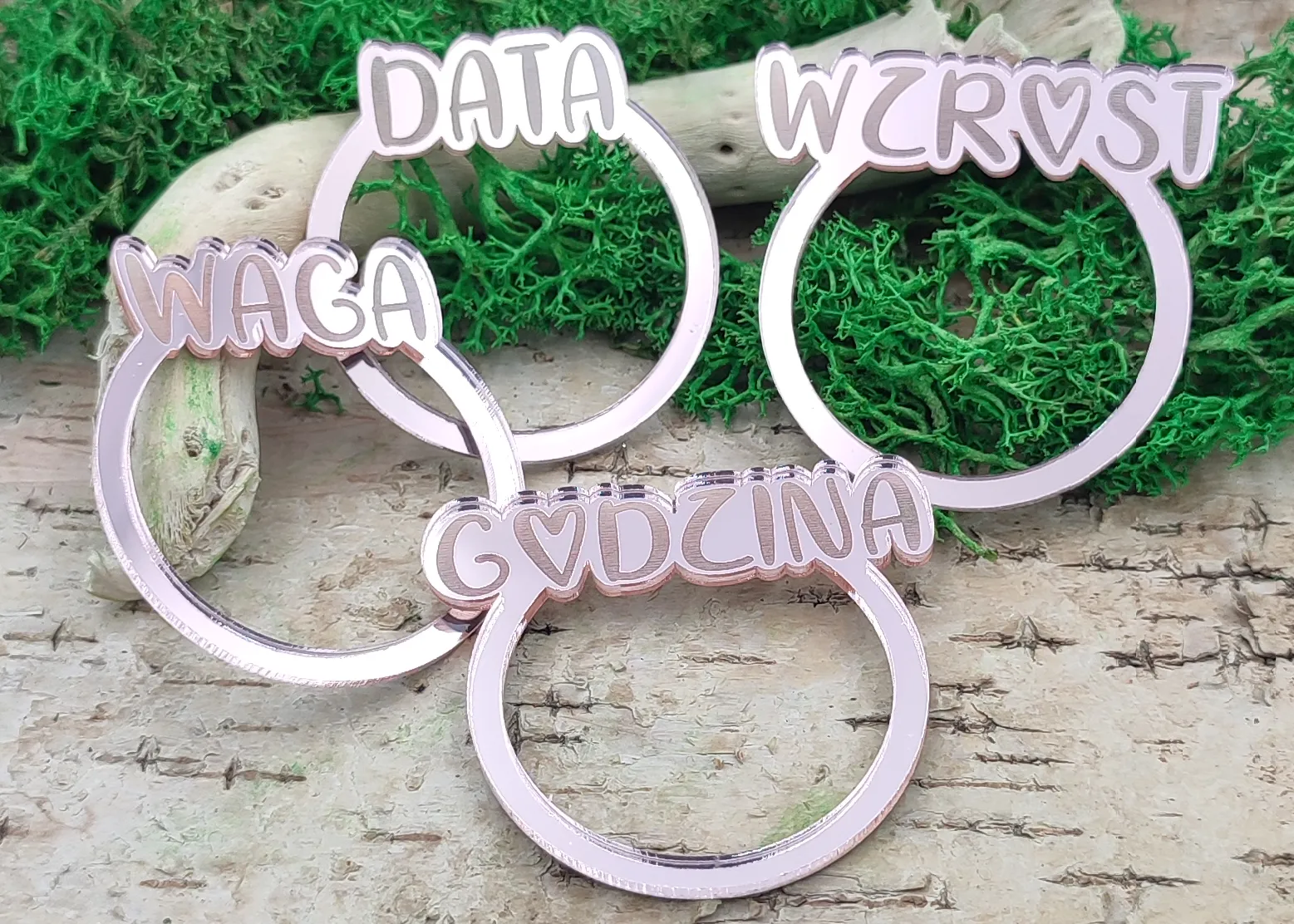 Ramki do metryczki w formie obręczy – zestaw z grawerowanymi napisami