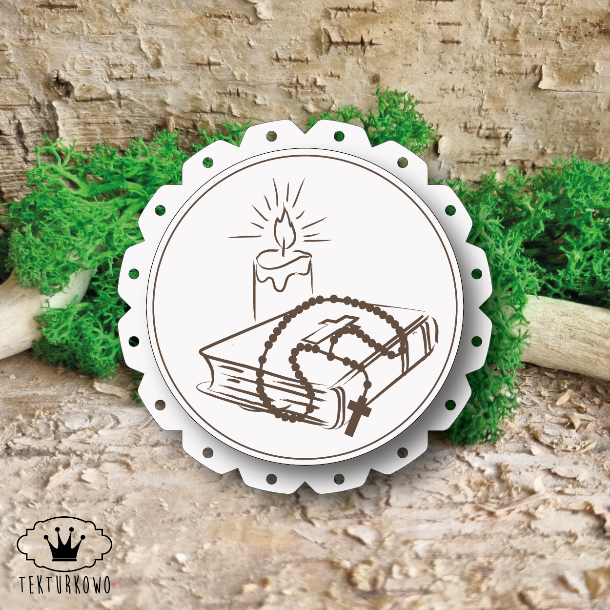 Elegancka, warstwowa tekturka przedstawiająca motywy świecy, książeczki i różańca, wykonana z wysokiej jakości beermaty o grubości 1,5 mm. Wymiary całego elementu: 63 × 63 mm.