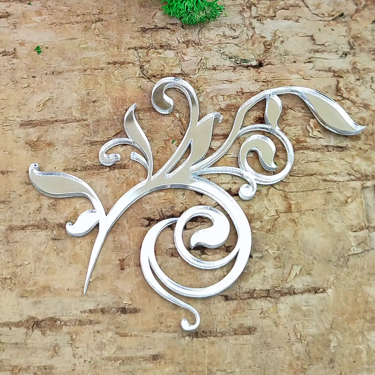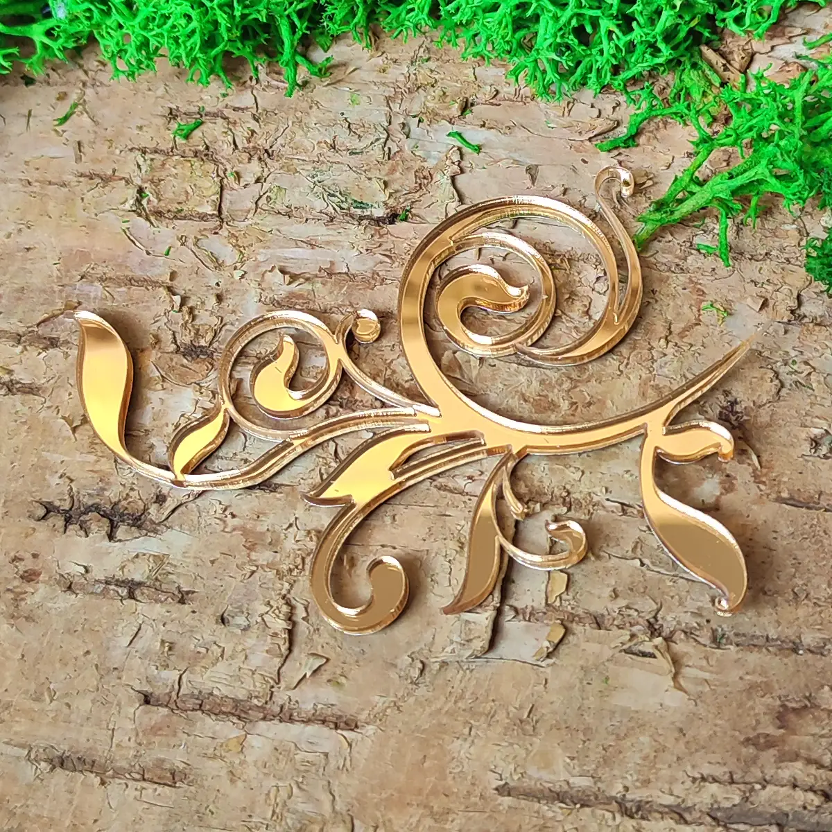 Dekoracyjny element w formie zawijasu z liśćmi, wykonany z lustrzanej pleksi o grubości 2 mm. Dostępny w dwóch wariantach kolorystycznych: złotym i srebrnym. Elegancki, subtelny akcent, który doda wyrafinowanego charakteru projektom handmade.